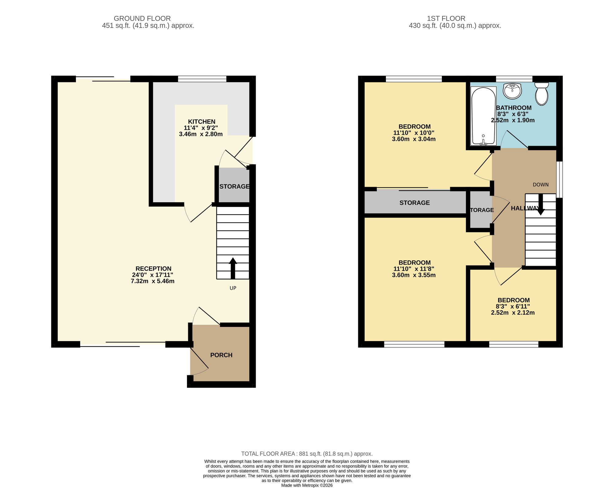 Upstairs, the property offers a modern family bathroom, two double bedrooms—one with built-in storage—and one single bedroom, providing comfortable accommodation for families or first-time buyers.