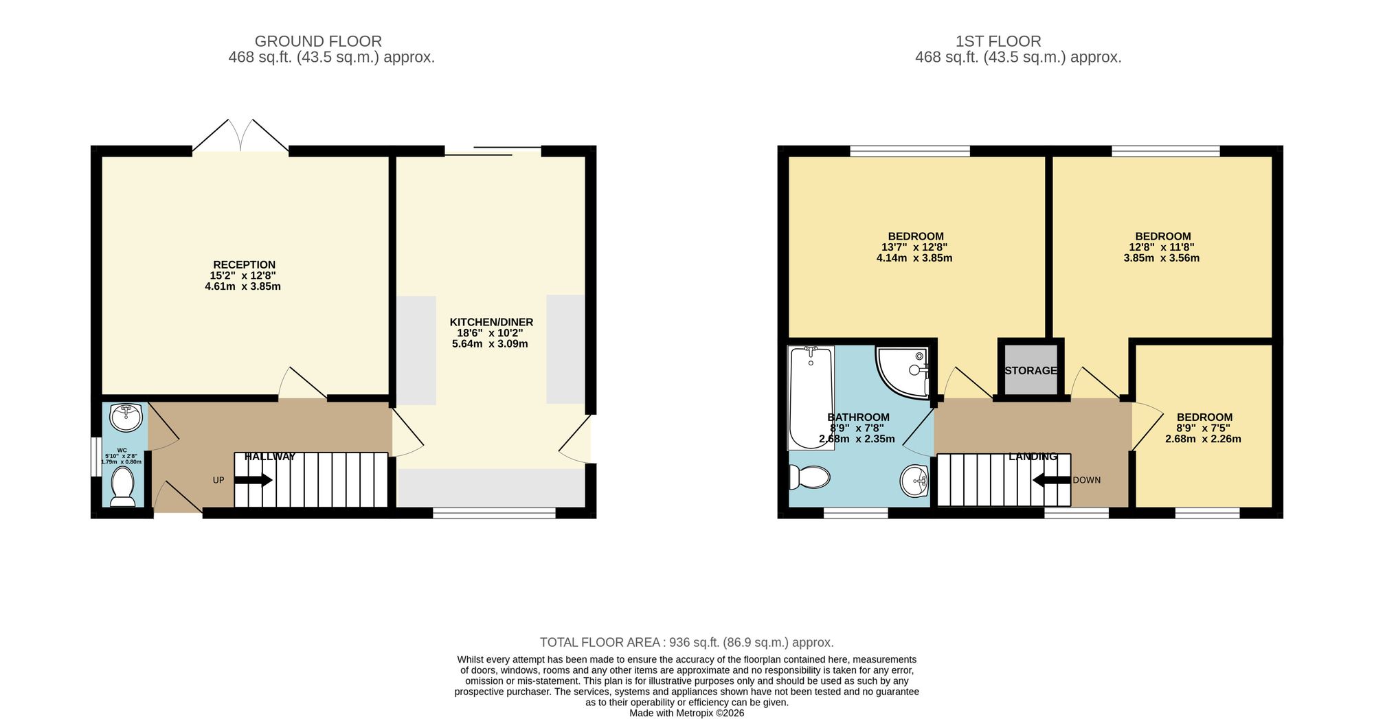 Upstairs, the landing benefits from useful storage. There are two generous double bedrooms and one single bedroom, along with a family bathroom fitted with both a separate shower and bath.