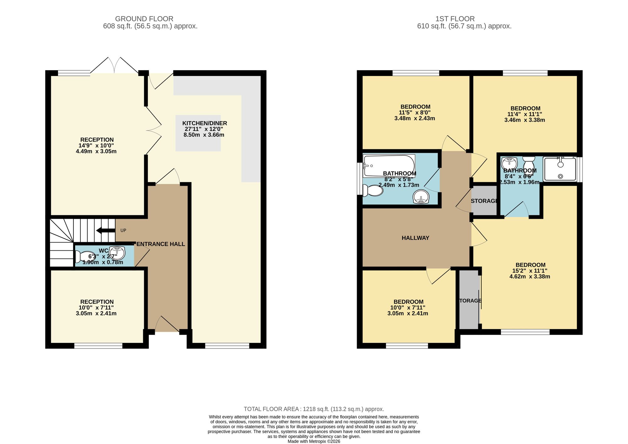 Upstairs, the property comprises four double bedrooms, including a master bedroom with built-in storage and an ensuite shower room. A modern family bathroom serves the remaining bedrooms. Additional storage is available via a boarded attic accessed by ladder.