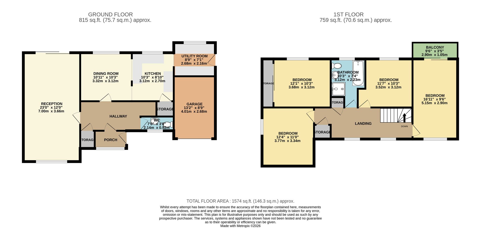 Upstairs, the landing includes built-in storage and leads to a spacious master bedroom with a rear-facing balcony, three further double bedrooms (one with storage), and a family bathroom complete with a separate bath and shower.