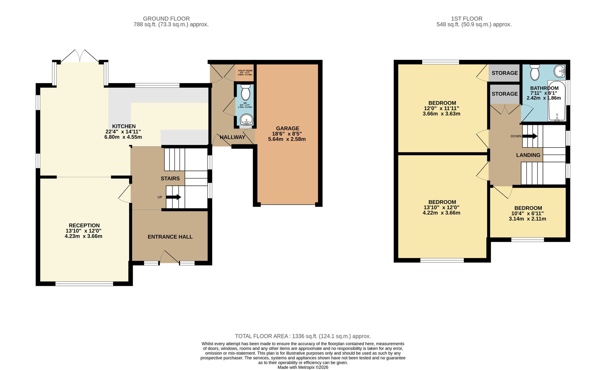 French doors lead out to the rear garden, which offers a mix of patio and lawn, ideal for both relaxing and entertaining. The ground floor also benefits from a WC and a separate utility room, accessed via its own corridor, which also provides internal access to the garage for added convenience.